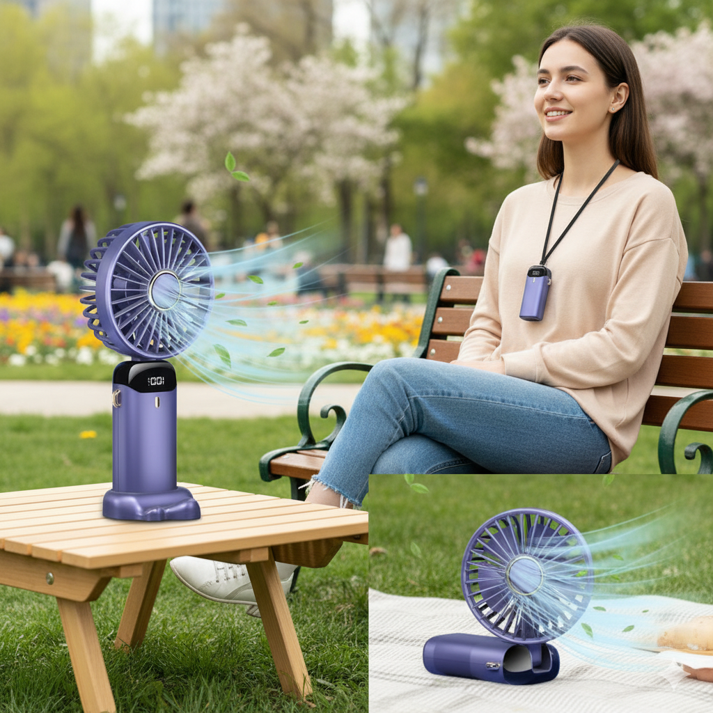 • 4-in-1 design: handheld fan, desk fan, neck-hanging fan, and holder fan